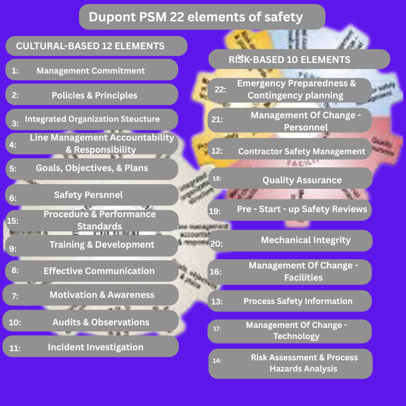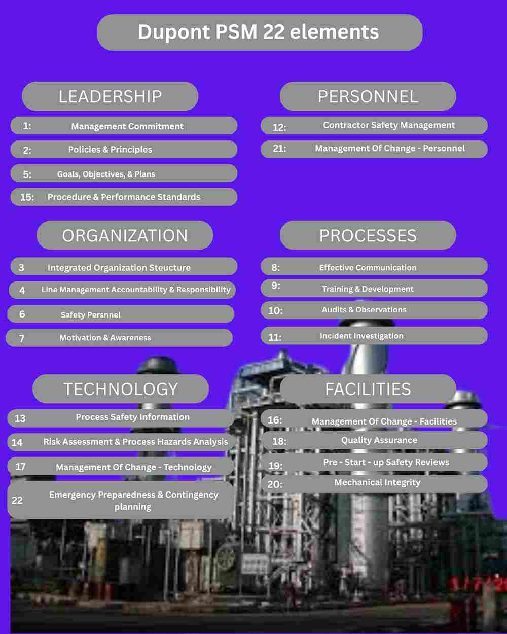 The DuPont PSM system, with its 22 elements, provides a comprehensive framework for ensuring process safety and operational excellence. By integrating leadership commitment, risk management, safety culture, and emergency preparedness, it minimizes accidents, injuries, and environmental impact. Clear procedures, training, and effective communication enhance workforce competence and awareness, while audits, incident investigations, and mechanical integrity ensure continuous improvement. Management of change and quality assurance reduce the likelihood of process deviations, equipment failures, or unsafe practices. Overall, the system promotes regulatory compliance, operational efficiency, and a strong safety culture, safeguarding employees, assets, and the surrounding community.