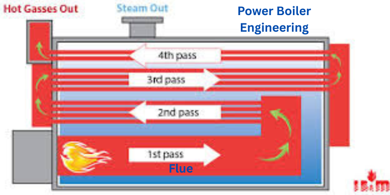 - The flue (or flue passages) connects the furnace to the fire tubes, allowing the hot combustion gases to flow through the boiler.